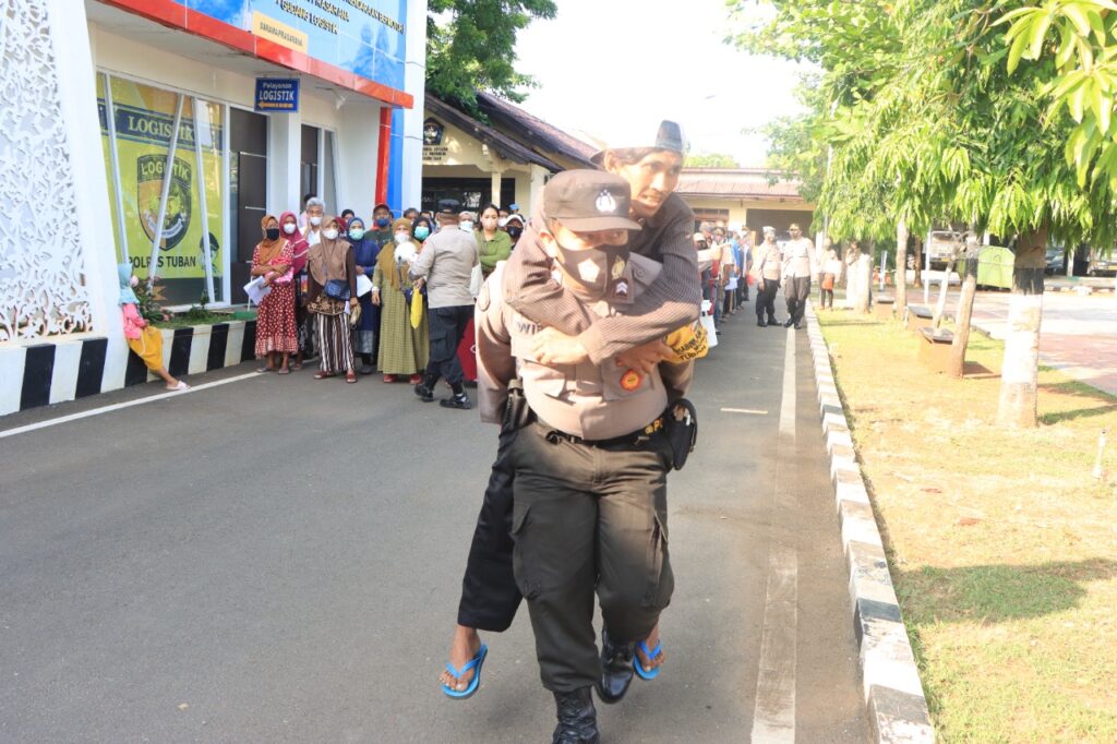 Briptu Wira (28) anggota Polres Tuban dengan Humanis menawarkan bantuan untuk menggendong saat melihat ada salah satu penerima bantuan yang kesulitan berjalan.