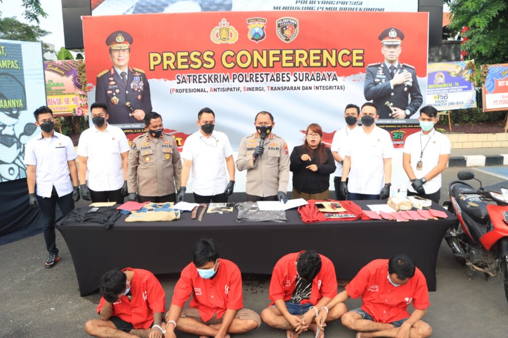 Waka Polrestabes AKBP Hartoyo, SIK, MH mengatakan, pelaku adalah JMH, (21) warga Jalan Putat Gede Timur, Surabaya, LE, (22), warga Jalan Kupang Gunung, Surabaya, TS, (23), warga Jalan Wonokitri, Surabaya, dan MFF, (21) warga Wonokitri, Surabaya.