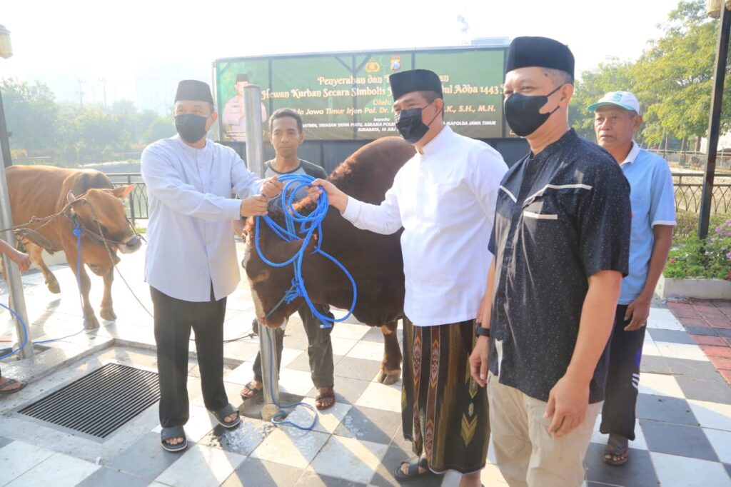 Pelaksanaan Penyerahan dan Penyembelihan Hewan Kurban Idul Adha 10 Dzulhijah 1443 H/2022 M Polda Jatim. Kegiatan tersebut merupakan sebagai upaya pembinaan mental dan rohani dalam rangka menanamkan nilai-nilai pengorbanan dan keikhlasan pengabdian insan Bhayangkara yang bertakwa gina mewujudkan Polri yang semakin Presisi.