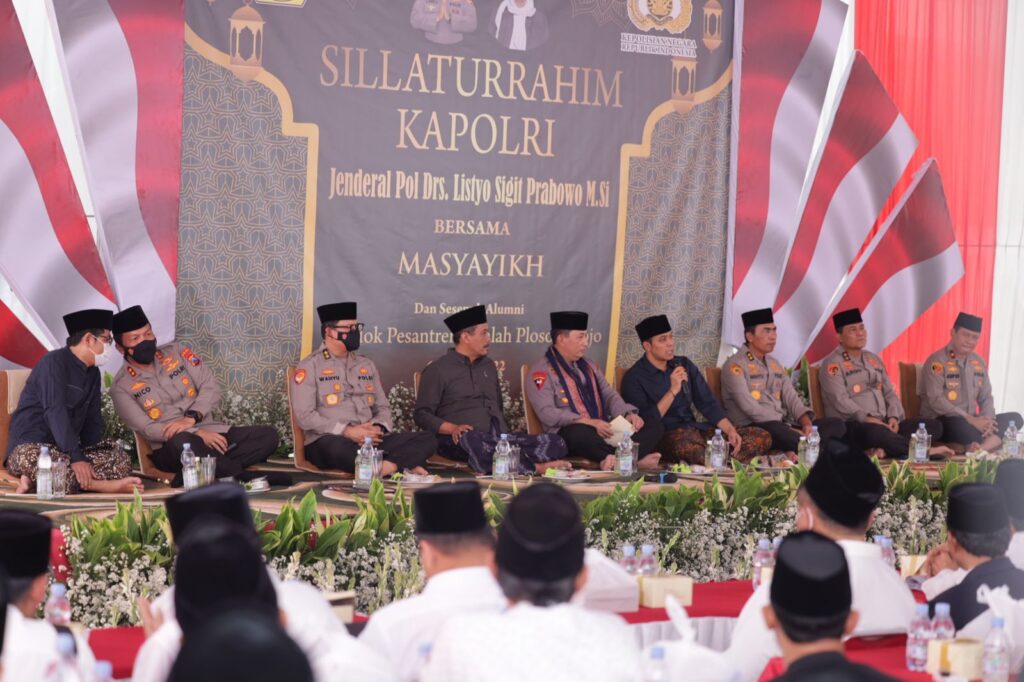 Kapolri Jenderal Listyo Sigit Prabowo beserta rombongan diantaranya Asrena Kapolri Irjen Pol Wahyu Hadiningrat, As SDM Kapolri Irjen Pol Wahyu Widada, Aslog Kapolri Irjen Pol R.P Argo Yuwono dan Dirtipidsiber Bareskrim Polri Brigjen Asep Edi Suheri dengan didampingi Kapolda Jatim Irjen Pol Nico Afinta serta pejabat utama Polda Jatim bersilaturahmi bersama Masyayikh dan sesepuh serta pengasuh Pondok Pesantren (Ponpes) Al Falah Ploso Kabupaten Kediri. Sabtu (6/8/2022).