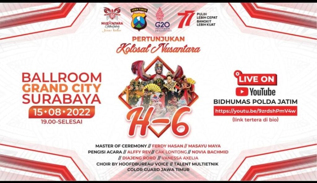 SURABAYA – Gebyar malam puncak Harmoni Nusantara Polda Jawa Timur 2022 akan segera digelar dengan pertunjukan kolosal pada hari Senin tanggal 15 Agustus 2022 di di Ballroom Grand City Surabaya.