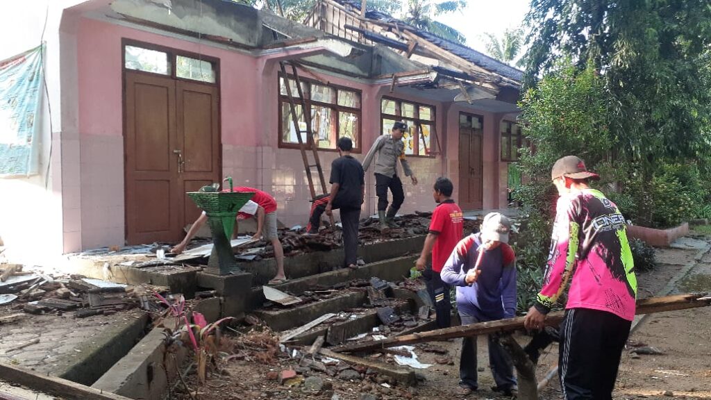 TRENGGALEK – Sejumlah petugas kepolisian bersama warga desa Bendoroto Kecamatan Munjungan melakukan kerja bakti membersihkan puing-puing material bangunan SMP Negeri 3 Munjungan yang ambruk.