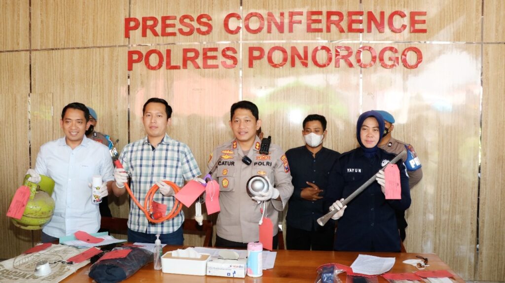 Kapolres Ponorogo AKBP Catur Cahyono Wibowo dalam pers rilis mengatakan pelaku S warga Desa Kunti, Kecamatan Sampung itu datang ke lokasi sembari membawa peranti lengkap berupa linggis, cat semprot, tabung gas elpiji melon, serta alat las.