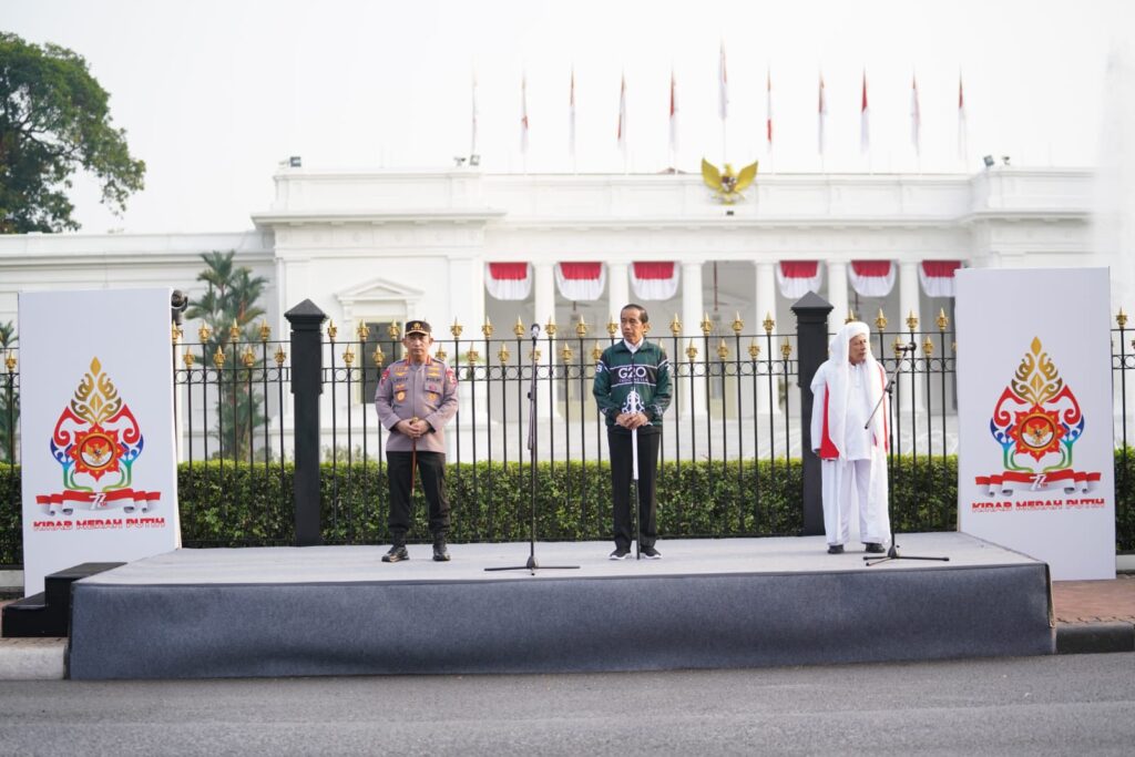Kirab merah putih ini dilepas oleh Presiden Indonesia Joko Widodo (Jokowi) dari depan istana merdeka bersama Ulama karismatik Habib Luthfi bin Ali bin Yahya dan Kapolri Jenderal Listyo Sigit.