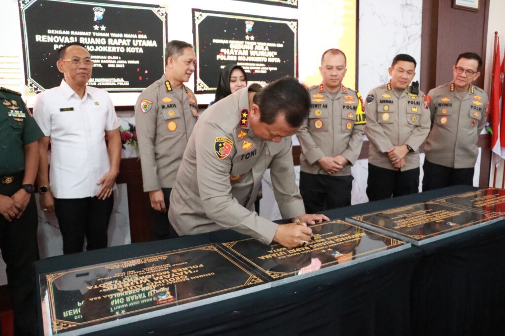 KOTA MOJOKERTO – Kunjungan kerja (kunker) Kapolda Jatim Irjen Pol Dr.Toni Harmanto,M.H ke Polres Mojokerto Kota kali ini sekaligus meresmian bangunan baru Mall Pelayanan Publik, Indomaret, dan Pembaharuan Aula. Dalam kunjungannya, Kapolda Jawa Timur Irjen Pol Dr. Toni Harmanto M.H,yang juga didampingi Pejabat Utama Polda Jatim itu juga memberikan ucapan selamat dan apresiasi inovasi Polres Mojokerto Kota dalam upaya meningkatkan pelayanan masyarakat.“Yang pertama saya sangat mengapresiasi dengan adanya inovasi sebanyak 4 gedung bangunan baru di Polresta Mojokerto ini”, ucap Irjen Pol Dr. Toni Harmanto saat meresmikan 4 gedung didampingi Kapolresta Mojokerto AKBP Wiwit Adisatria S.H., Selasa (17/5).Renovasi Aula Prabu Hayam Wuruk dan Aula Rupatama, yang mengusung tema digitalisasi ini telah dibuat dengan konsep modern minimalis. Perbaikan gedung memang ditujukan untuk meningkatkan keamanan dalam bekerja.Pembaharuan tersebut terkait dengan penggantian kamera Webcam untuk meningkatkan kualitas gambar saat rapat daring.Selain itu juga pemasangan perangkat sound sistem untuk meningkatkan kualitas suara di aula, serta ditambah pemasangan led Videotron display untuk memberikan kenyamanan serta efisiensi dalam rapat virtual, presentasi baik paparan maupun video.Kapolda Jatim juga mengucapkan terimakasih kepada jajaran forkopimda Mojokerto Kota yang kompak dan guyub rukun.“Terimakasih pada jajaran forkopimda atas dukungannya yang kompak dan guyub rukun sehingga bisa menghadiri peresmian ini, “ ungkap Irjen Toni.Menurut Kapolda Jatim, terobosan yang memang sangat dibutuhkan itu guna menunjang kinerja personel dalam hal ini Polresta Mojokerto. “Meski mengalami pembaharuan, fungsi dari aula tersebut tetaplah sama yakni digunakan untuk kegiatan internal Polresta Mojokerto serta kegiatan external yang mendatangkan tamu dari masyarakat umum dan stakholder terkait,”pungkas Kapolda Jatim. (*)