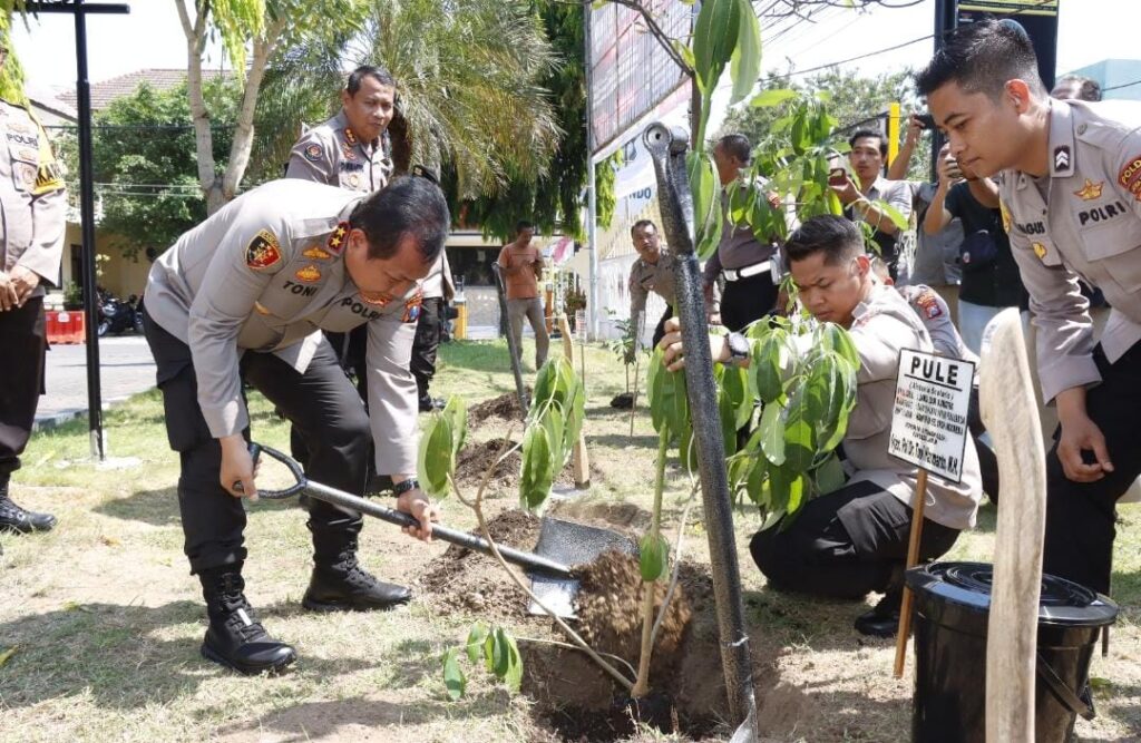 SITUBONDO, Kapolda Jatim Irjen Pol Dr. Toni Harmanto, M.H, kembali melaksanakan kunjungan kerja ke satuan wilayah jajaran Polda Jawa Timur. Kali ini Kapolda Jatim bersama rombongan Pejabat Utama Polda Jatim mengunjungi Polres Situbondo, Rabu (24/5/2023).Memasuki Polres Situbondo, Kapolda Jatim disambut sholawat yang diiringi alunan hadrah kemudian dilanjutkan memberikan pengarahan kepada Pejabat Utama, Kapolsek Jajaran dan seluruh Perwira Polres Situbondo di ruang Tribata.Turut menyambut rombongan Kapolda Jatim diantaranya Bupati Situbondo Drs. H. Karna Suswandi, M.M., Kapolres Situbondo AKBP Dwi Sumrahadi Rakhmanto, S.H.,S.I.K.,M.H., Dandim 0823 Situbondo Letkol Inf Bayu Anjas Asmoro, S.E., Ketua DPRD Edy Wahyudi, S.E, Kajari Ginanjar Cahya Permana, S.H., M.H, Ketua Pengadilan Ahmad Rasjid, S.H., dan Kepala Rutan Rudi Kristiawan.Dalam sambutannya, Kapolda Jatim Irjen Pol Dr.Toni Harmanto, M.H menyampaikan, kunjungan kerja (kunker) kali ini untuk bersilaturahmi dan tatap muka secara langsung dengan anggota Polres Situbondo.”Kami ingin berdialog langsung serta mendengar masukan-masukan yang dirasakan oleh anggota. Apa yang menjadi kesulitan maupun keinginan dan sebagainya di Polres Situbondo selama ini belum terakomodir bisa disampaikan ,”ungkap Irjen Toni.Dalam arahannya, Kapolda Jatim berpesan kepada seluruh Perwira untuk senantiasa menanamkan keteladanan yang baik dengan banyak bersyukur dan perbanyak banyak amal serta tetap berikhtiar dalam setiap melaksanakan tugas.“ Jangan bosan mengingatkan anggota, sekaligus sebagai seorang Pemimpin harus peka terhadap permasalahan anggota dan bisa segera dicarikan solusi terbaik dan bijaksana. Semoga apa yang Kita kerjakan dan lakukan anggap saja sebagai lahan ibadah ” tutur Irjen Toni.Kapolda Jatim juga menyempatkan diri melaksanakan salat dzuhur berjamaah di Masjid Al-Asykar dan dilanjutkan dengan pemberian santunan kepada anak yatim piatu binaan Polres Situbondo. Sebelum mengakhiri kunjungannya, Kapolda Jatim bersama Pejabat Utama Polda melakukan penanaman pohon Sawo Kecik dan pohon Pule di halaman Mapolres Situbondo. Kedua pohon ini dipilih karena banyak sekali manfaatnya terutama untuk obat-obatan.Kapolda Jatim berharap, kegiatan pemanfaatan lahan pertanian bisa ditindaklanjuti oleh Polres Situbondo melalui kerjasama lahan dengan perhutani untuk peningkatan perekonomian keluarga, bangun usaha untuk meningkatkan perekonomian keluarga.“ Agar Kapolres dan jajarannya bisa lebih gencar mensosialisasikan pentingnya penghijauan dan pelestarian lingkungan kepada masyarakat termasuk pemanfaatan lahan pertanian untuk meningkatkan perekonomian keluarga ” pungkasnya. (*)