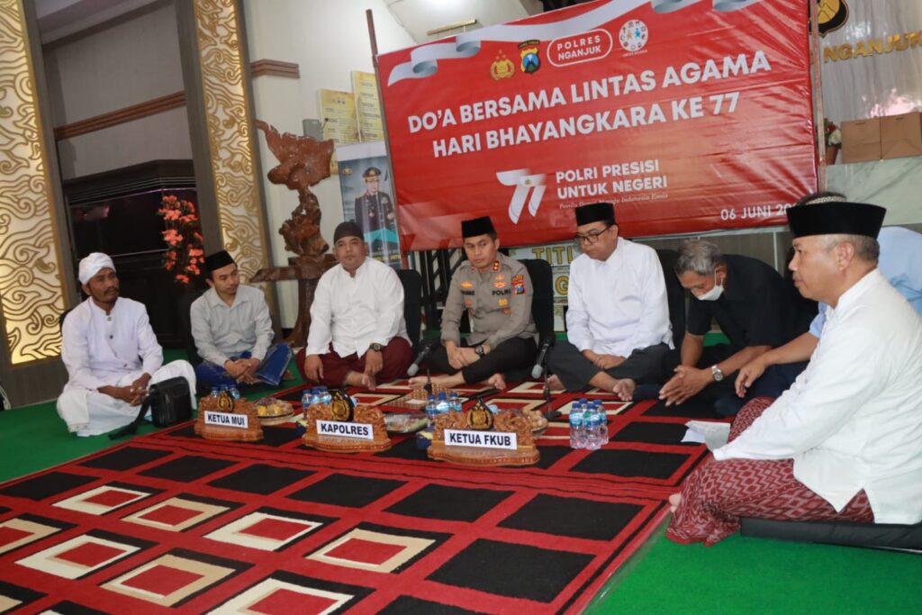 NGANJUK – Kapolres Nganjuk AKBP Muhammad, S.H., S.I.K., M.Si. beserta seluruh jajaran pejabat utama Polres Nganjuk menggelar acara doa bersama lintas agama dalam rangkaian peringatan hari Bhayangkara ke -77, Selasa (6/6/2023).