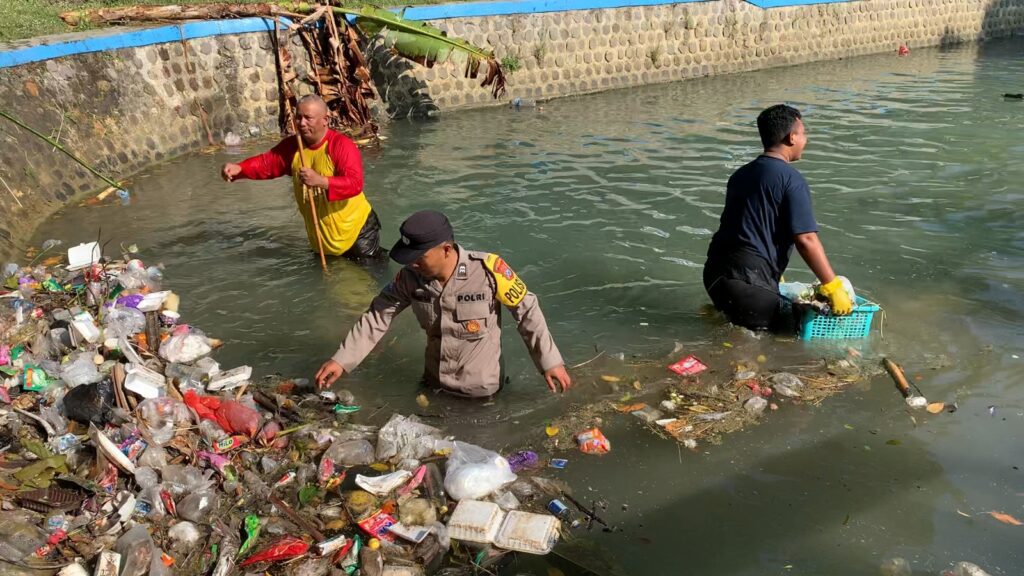 Aksi nyata Polisi RW bersama komunitas pemuda pemudi peduli lingkungan dan warga gotong – royong membersihkan sampah plastik di aliran sungai dari Goa Ngerong.