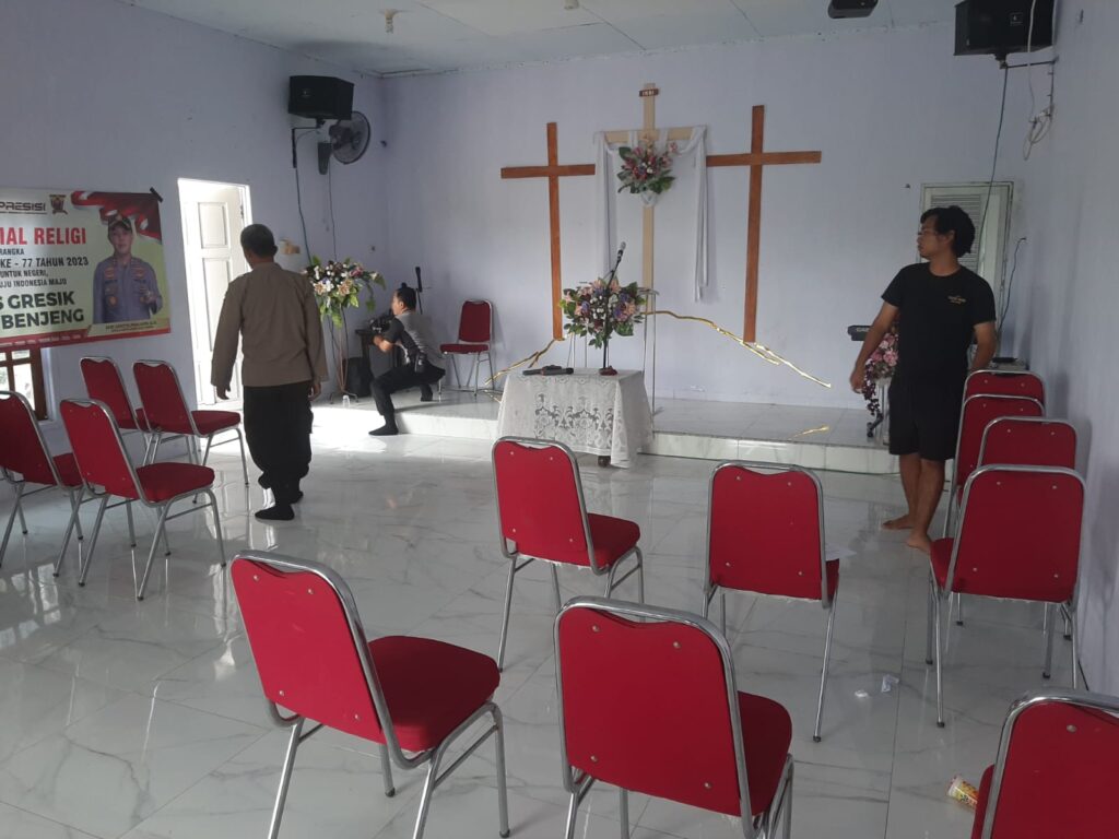 GRESIK: Menyambut Hari Bhayangkara ke- 77, Polsek Benjeng Polres Gresik Polda l melaksanakan bakti sosial pembersihan rumah ibadah. Bakti sosial dan pembersihan dilakukandi Gereja GKJW.