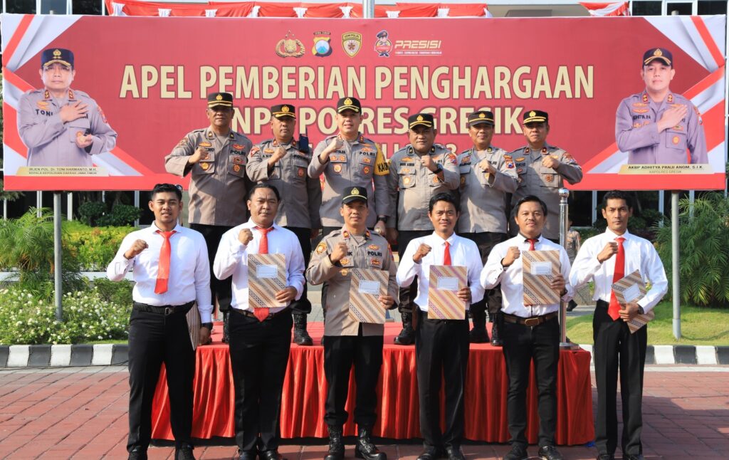 GRESIK – Kepala Kepolisian Resor Gresik AKBP Adhitya Panji Anom pimpin apel pemberian penghargaan kepada personel Polres Gresik yang berprestasi di halaman Mapolres.Gresik Senin (24-07-2023). Sejumlah personel Polres Gresik tampak sumringah karena kerja keras mereka diapresiasi.