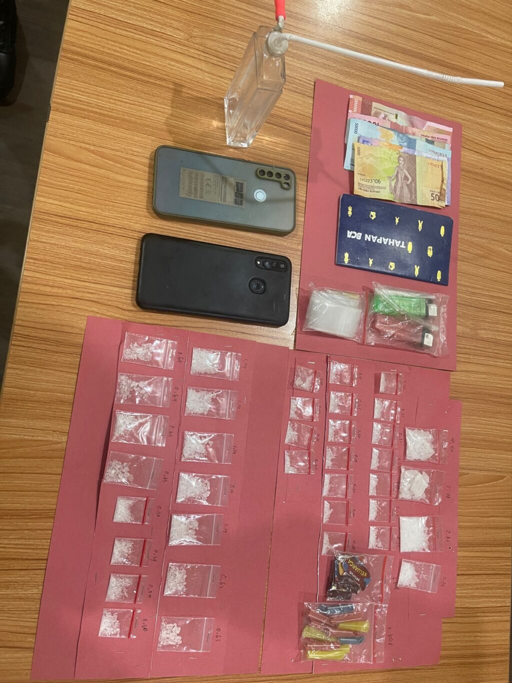 Kemudian ada seperangkat alat hisa sabu terdiri dari botol bekas parfum kaca yang telah dimodifikasi.