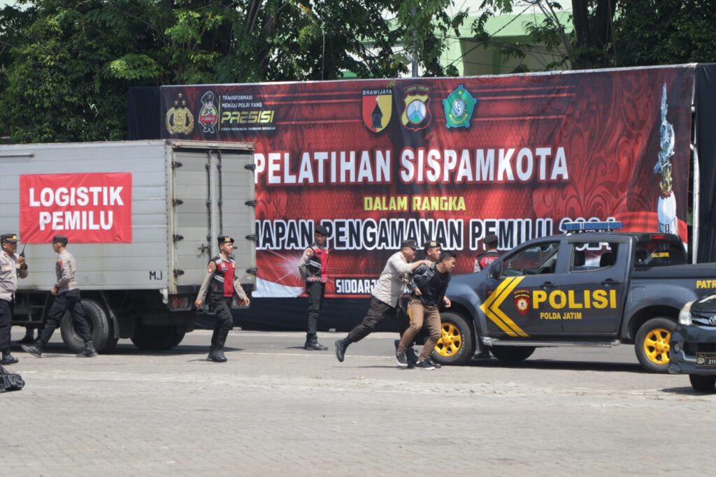 SIDOARJO – Polda Jawa Timur menggelar Bintek Pelatihan Sistem Pengamanan Kota (Sispamkota) dalam rangka kesiapan pengamanan Pemilu 2024, di Gedung Serbaguna Polresta Sidoarjo, Selasa (22/8/2023).