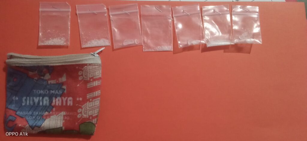 Petugas berhasil mengamankan barang bukti Narkotika sabu sebanyak tujuh poket dengan rincian berat 0,56 gram, 0,47 gram, 0,51 gram, 0,44 gram, 0,31 gram, 0,50 gram, 0,51 gram. Berat total : 3,30 gram setelah ditimbang dengan bungkus plastik bening dari tangan Abdilla.