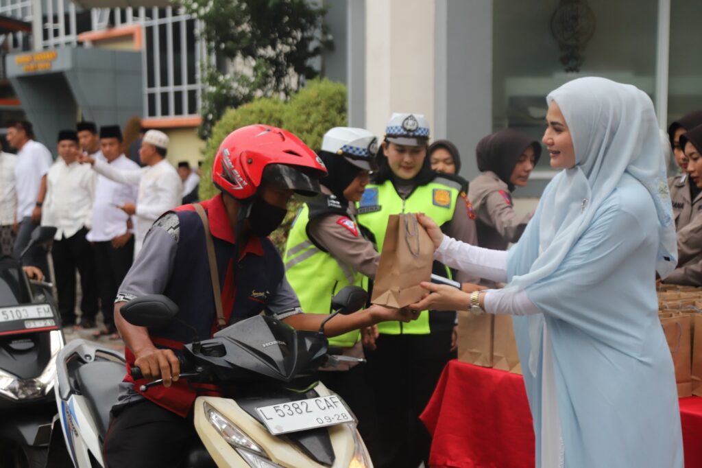Ketua Bhayangkari Cabang Gresik Ny. Myrna Adhitya dan pengurus Bhayangkari terlihat membantu Polwan Gresik membagikan takjil kepada pengendara maupun masyarakat yang lewat depan Polres Gresik.