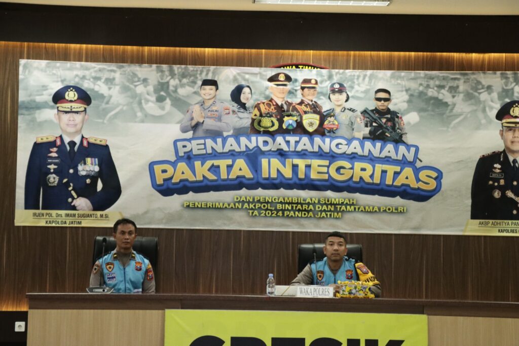 GRESIK – Bertempat di ruang Rupatama Polres Gresik, dilaksanakan Penandatanganan Pakta Integritas Penerimaan Taruna/Taruni Akademi Kepolisian (Akpol) Bintara dan Tamtama Tahun 2024 secara virtual.Jumat(19-04_2024)