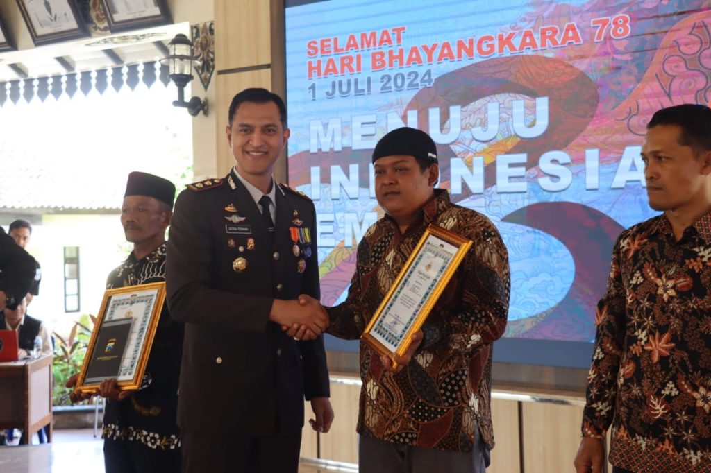 Penghargaan diserahkan kepada Sukardi, Fery Andrik Setyawan dan Priyanto dalam rangkaian tasyakuran Hari Bhayangkara ke-78 yang dilaksanakan di Pendopo Surya Graha, Senin (1/7/2024) yang lalu.