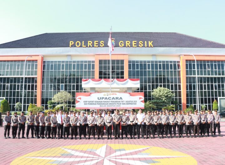 GRESIK – Kapolres Gresik AKBP Rovan Richard Mahenu memimpin langsung upacara Korp Raport Kenaikan Pangkat Pengabdian dan...