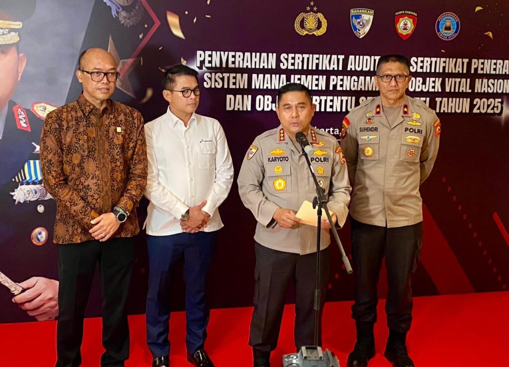Jakarta — Badan Pemelihara Keamanan (Baharkam) Polri secara simbolis menyerahkan Sertifikat Audit Penerapan Sistem Pengamanan Objek Vital Nasional dan Objek Tertentu serta Hotel Tahun 2025. Kegiatan tersebut berlangsung di Gedung Auditorium Lantai 3 PT PLN (Persero), Senin (15/12/2025), sekitar pukul 10.45 WIB.